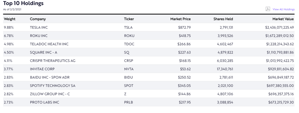 As of 2 February 2021, its top three holdings Tesla, Roku and Teladoc Health made up 21.64% of the fund. The portfolio itself only holds 54 securities. While the concentrated strategy has worked so far for ARKK, it also comes with more risk than a regular ETF which may hold hundreds of companies in their fund.