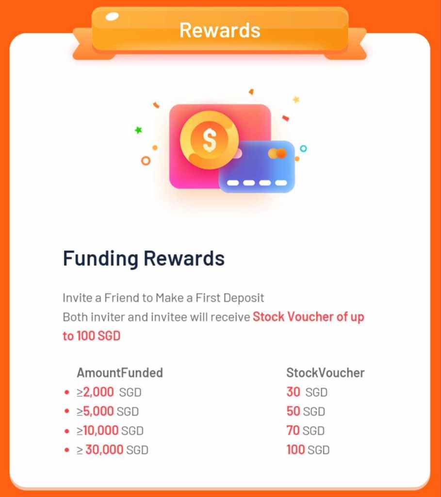 You’ll receive up to S$100 when you make a first deposit into your account of $30,000 or more. Bonus: You don’t have to actually invest all your funds to qualify for the stock voucher. More details below!