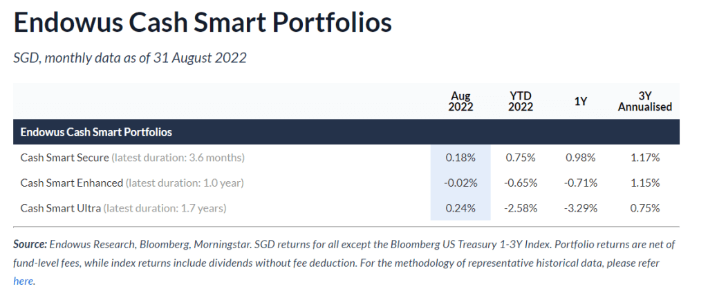 For Enhanced, there’s a wider dispersion in performance. Returns were negative in Q1 2022, steadied in Q2 2022, and became slightly negative in August. According to an Endowus update, this was due to the performance of the United SGD Fund, which has since rebounded in September.