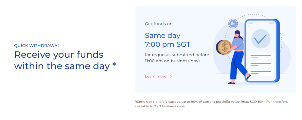 What we really like is that you can get your withdrawals on the same-day, albeit capped at S$10,000. This is a feature that only Syfe is providing at the moment.