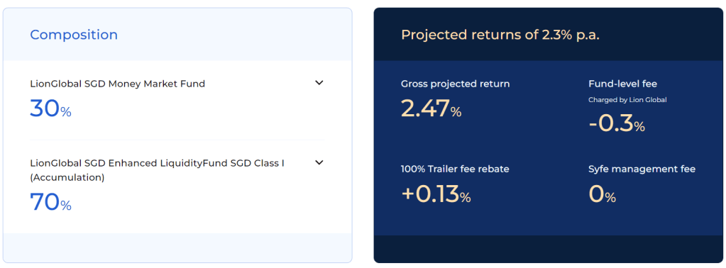 Interestingly, the composition for Stashaway Simple is exactly the same as Syfe Cash+. Both products hold 30% of LionGlobal SGD Money Market Fund and 70% of LionGlobal SGD Enhanced Liquidity Fund.