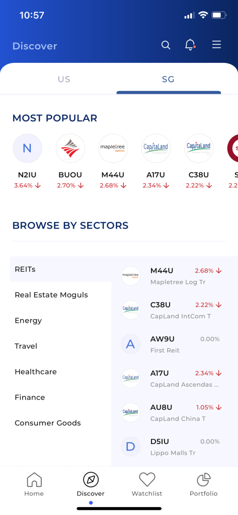 So I like that Syfe Trade has a clean interface. Plus, it’s easy to get trading ideas. Go to the “Discovery” tab and you can browse the “Most popular” stocks or check out themes like “High dividends” or “Owned by Temasek“.